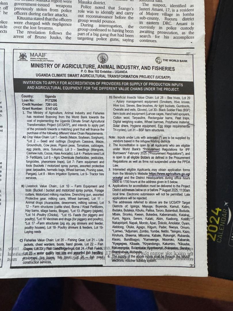Eligible bidders/applicants are hereby invited for accreditation of providers for supply of production inputs and Agricultural Equipment for the different value chains under the Uganda Climate Smart Agricultural Transformation Project (UCSATP) before 7th August 2025 as per the attached Advert.Applicants are asked to obtain application forms from the Ministry's website https://www.agriculture.go.ug/ucsatp/ and the District Headquarters.
